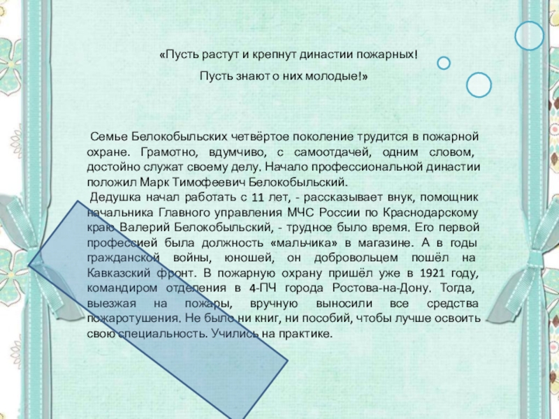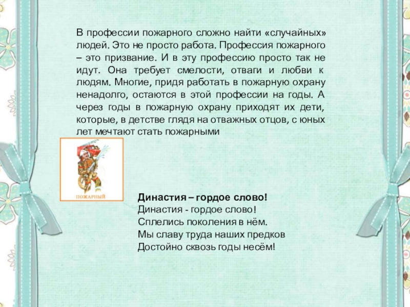 Слайд 7 «Пусть растут и крепнут династии пожарных!