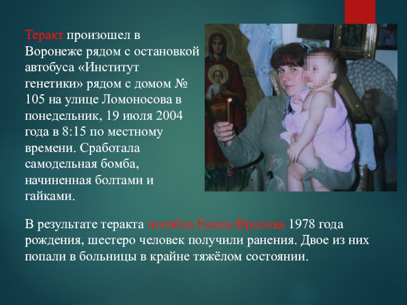 В результате теракта погибла Елена Фролова 1978 года рождения, шестеро человек получили ранения. Двое из них попали в больницы в крайне тяжёлом состоянии.
