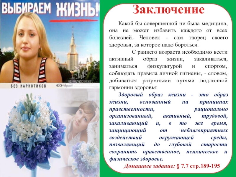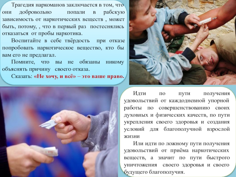 Или идти по ложному пути получения удовольствий от приёма наркотических веществ, а значит по пути быстрого уничтожения своего здоровья и своего будущего благополучия.