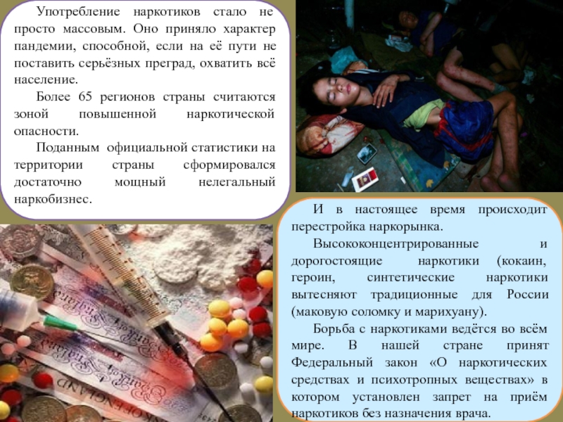 Высококонцентрированные и дорогостоящие наркотики (кокаин, героин, синтетические наркотики вытесняют традиционные для России (маковую соломку и марихуану).
