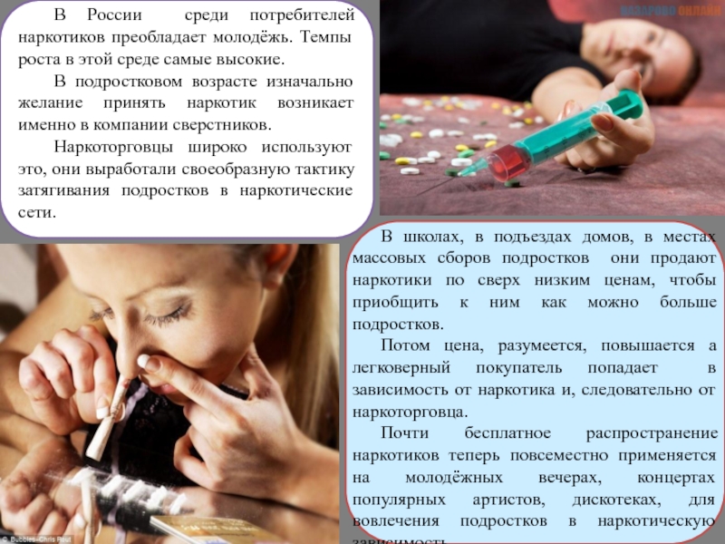 В школах, в подъездах домов, в местах массовых сборов подростков они продают наркотики по сверх низким ценам, чтобы приобщить к ним как можно больше подростков.