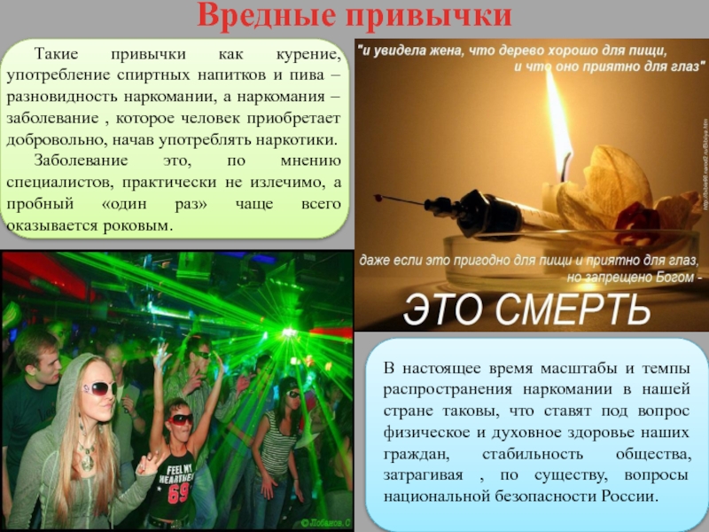 В настоящее время масштабы и темпы распространения наркомании в нашей стране таковы, что ставят под вопрос физическое и духовное здоровье наших граждан, стабильность общества, затрагивая , по существу, вопросы национальной безопасности России.