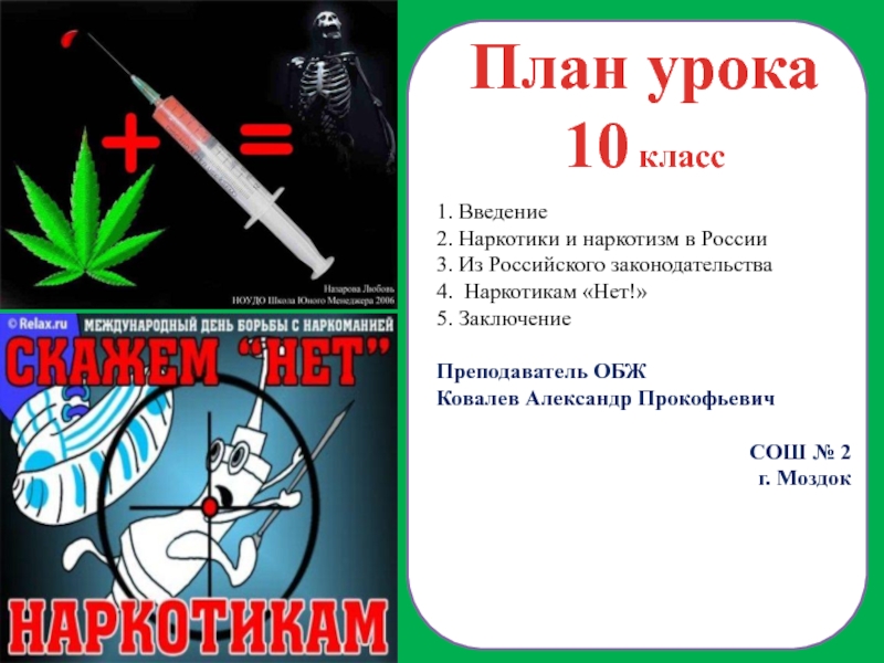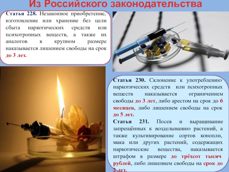 Борьба с наркотиками ведётся во всём мире. В нашей стране принят Федеральный закон «О наркотических средствах и психотропных веществах» в котором установлен запрет на приём наркотиков без назначения врача.