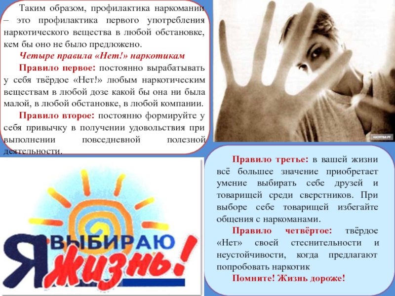 Правило третье: в вашей жизни всё большее значение приобретает умение выбирать себе друзей и товарищей среди сверстников. При выборе себе товарищей избегайте общения с наркоманами.