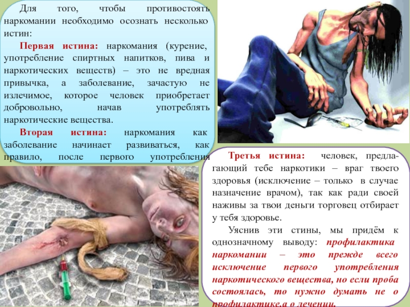 Третья истина: человек, предла-гающий тебе наркотики – враг твоего здоровья (исключение – только в случае назначение врачом), так как ради своей наживы за твои деньги торговец отбирает у тебя здоровье.