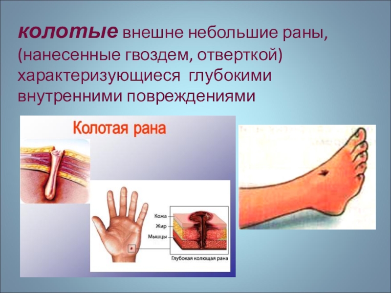 Слайд 11колотые внешне небольшие раны, (нанесенные гвоздем, отверткой) характеризующиеся глубокими внутренними повреждениями