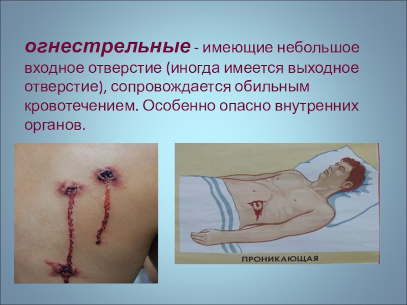 огнестрельные - имеющие небольшое входное отверстие (иногда имеется выходное отверстие), сопровождается