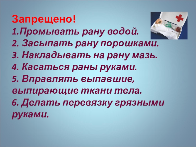 3. Промыть рану перекисью водорода (исключено : водой, зеленкой, йодом, спиртом).