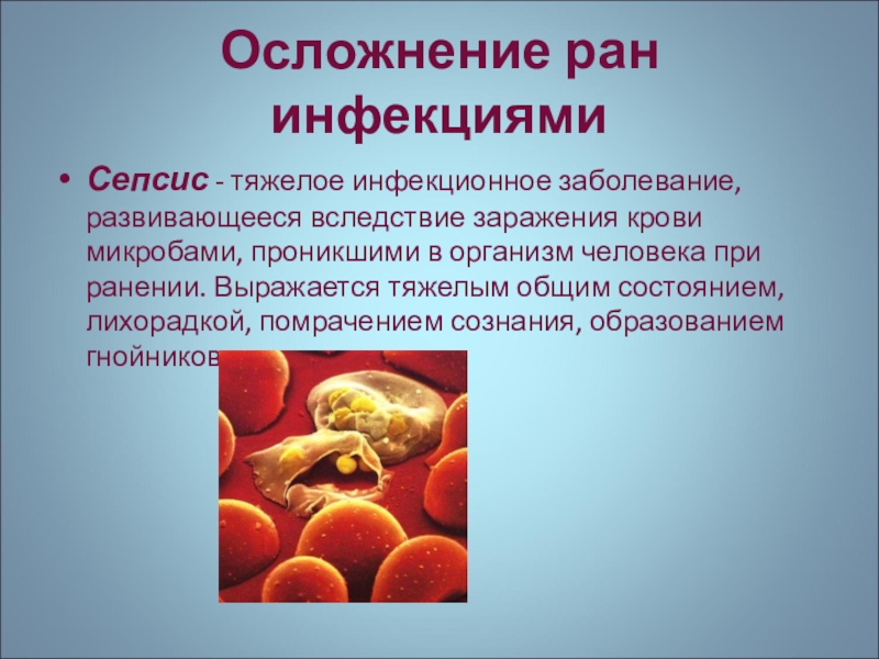 микробами, проникшими в организм человека при ранении. Выражается тяжелым общим состоянием, лихорадкой, помрачением сознания, образованием гнойников в органах.