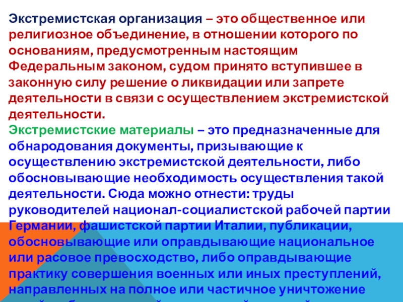 Слайд 17Экстремистская организация – это общественное или религиозное объединение, в отношении которого