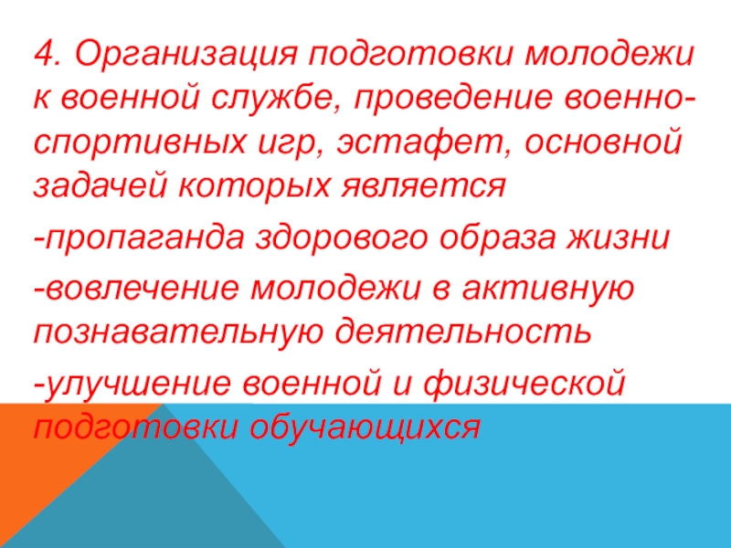 Слайд 264. Организация подготовки молодежи к военной службе, проведение военно- спортивных игр,