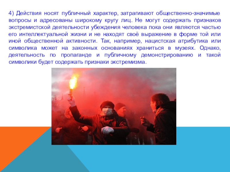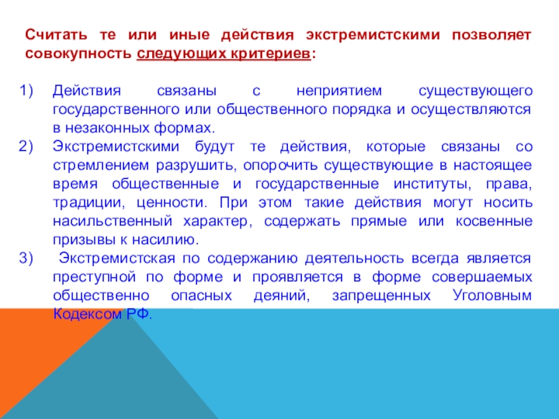 Слайд 4Считать те или иные действия экстремистскими позволяет совокупность следующих критериев: