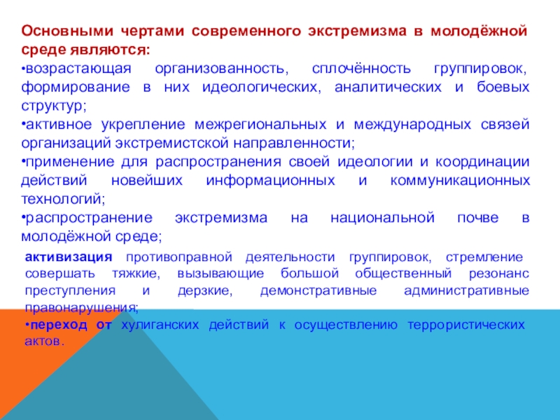 Слайд 12Основными чертами современного экстремизма в молодёжной среде являются: