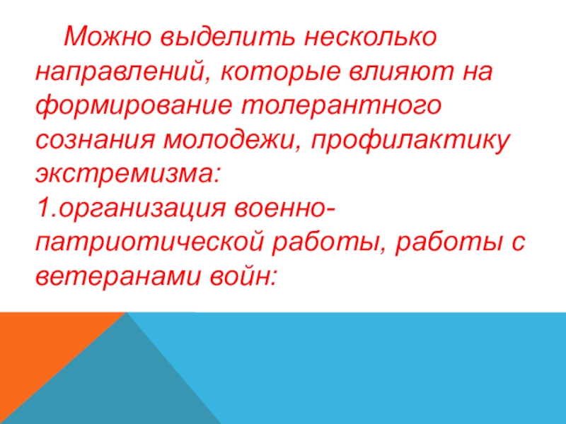 Слайд 19 Можно выделить несколько направлений, которые влияют на формирование толерантного сознания молодежи,