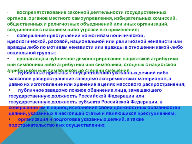 Слайд 16• воспрепятствование законной деятельности государственных органов, органов местного самоуправления, избирательных комиссий, общественных