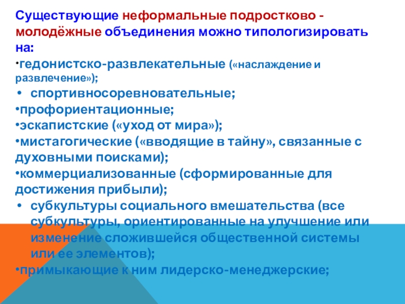 Слайд 8Существующие неформальные подростково - молодёжные объединения можно типологизировать на: