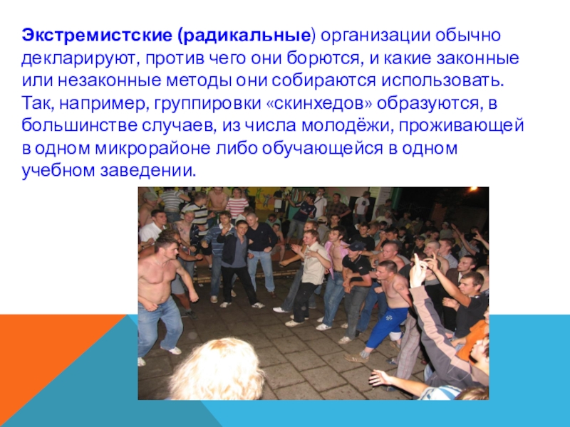 Слайд 9Экстремистские (радикальные) организации обычно декларируют, против чего они борются, и какие