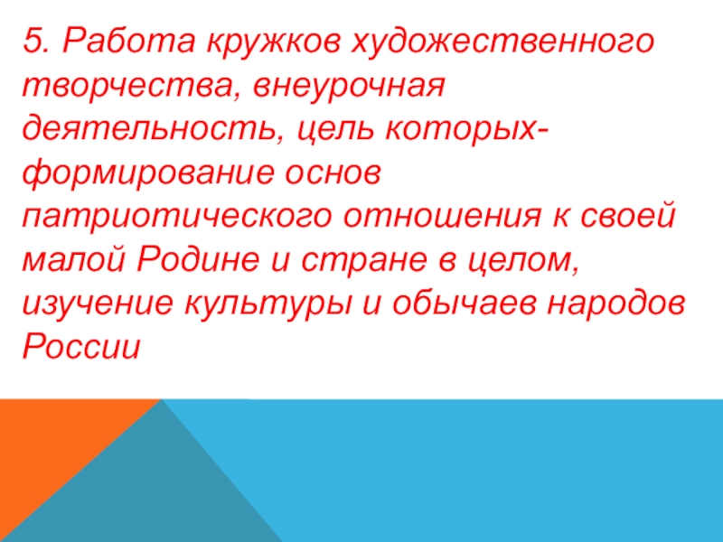 Слайд 285. Работа кружков художественного творчества, внеурочная деятельность, цель которых- формирование основ