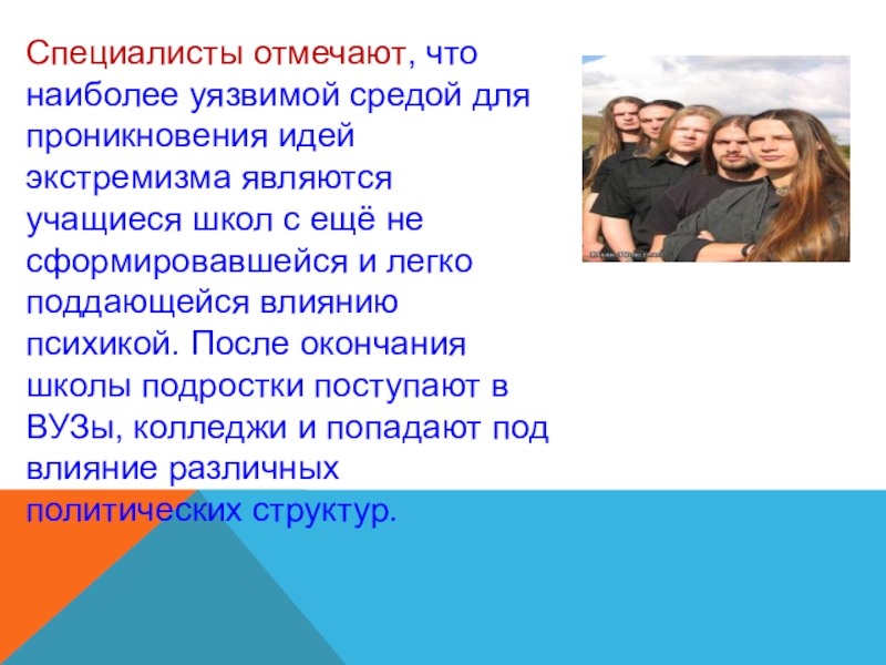 Слайд 11Специалисты отмечают, что наиболее уязвимой средой для проникновения идей экстремизма являются