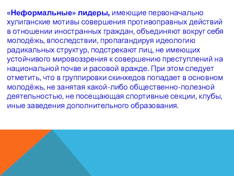 Слайд 10«Неформальные» лидеры, имеющие первоначально хулиганские мотивы совершения противоправных действий в отношении