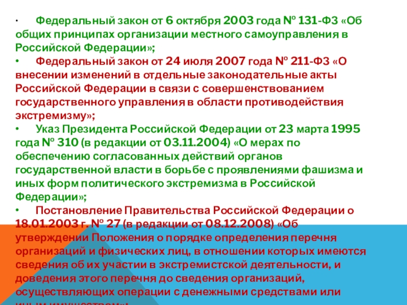 • Постановление Правительства Российской Федерации о 18.01.2003 г. № 27 (в редакции от 08.12.2008) «Об утверждении Положения о порядке определения перечня организаций и физических лиц, в отношении которых имеются сведения об их участии в экстремистской деятельности, и доведения этого перечня до сведения организаций, осуществляющих операции с денежными средствами или иным имуществом»;