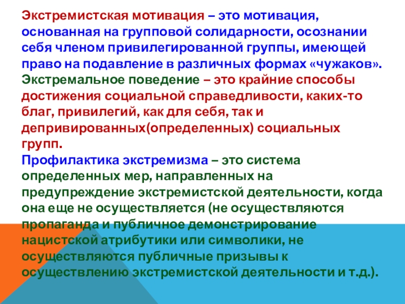 Слайд 18Экстремистская мотивация – это мотивация, основанная на групповой солидарности, осознании себя