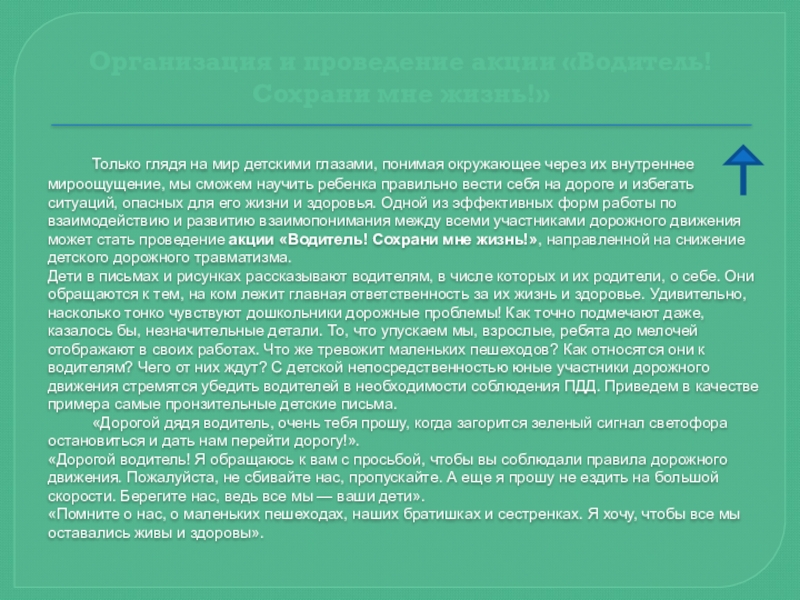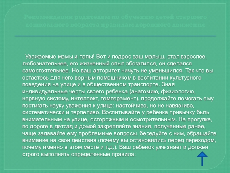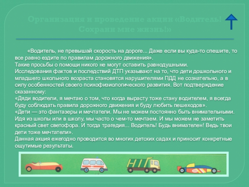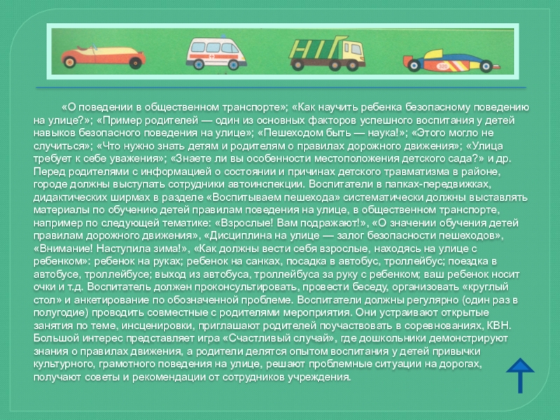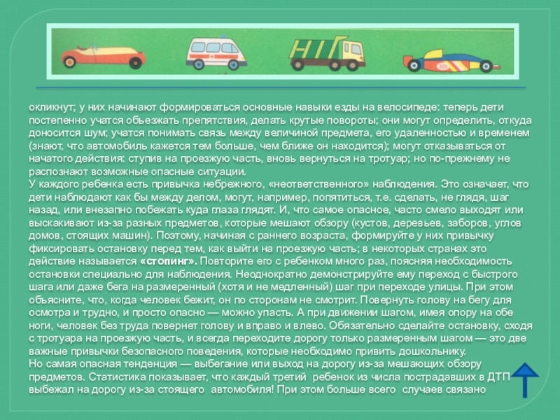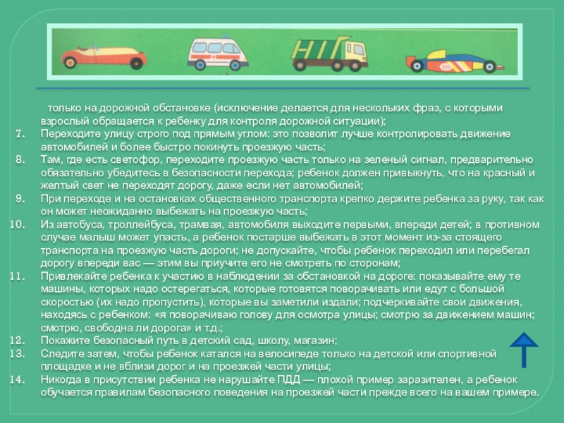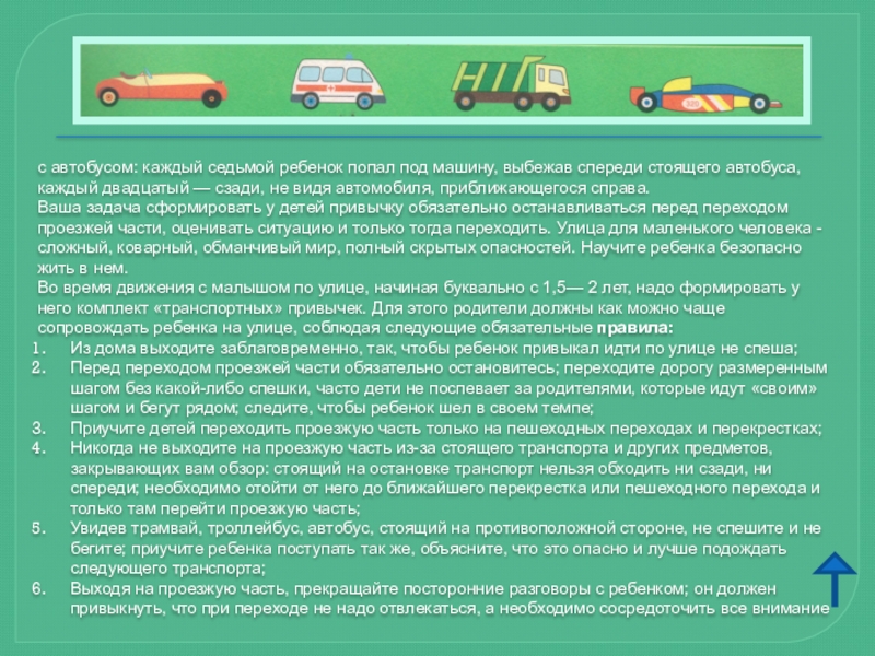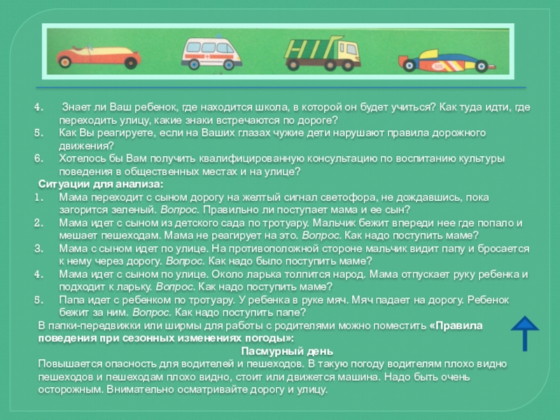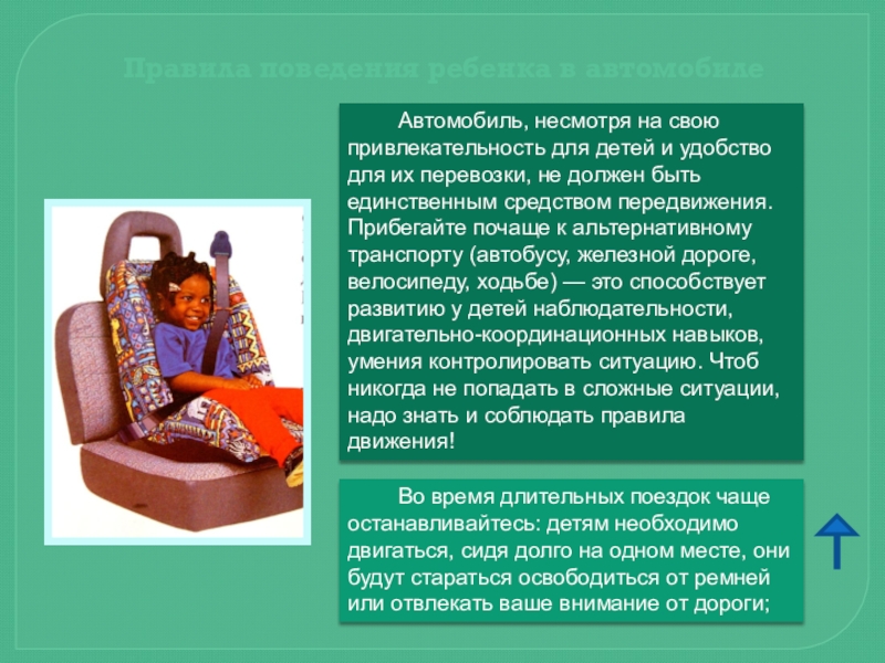 Автомобиль, несмотря на свою привлекательность для детей и удобство для их перевозки, не должен быть единственным средством передвижения. Прибегайте почаще к альтернативному транспорту (автобусу, железной дороге, велосипеду, ходьбе) — это способствует развитию у детей наблюдательности, двигательно-координационных навыков, умения контролировать ситуацию. Чтоб никогда не попадать в сложные ситуации, надо знать и соблюдать правила движения!