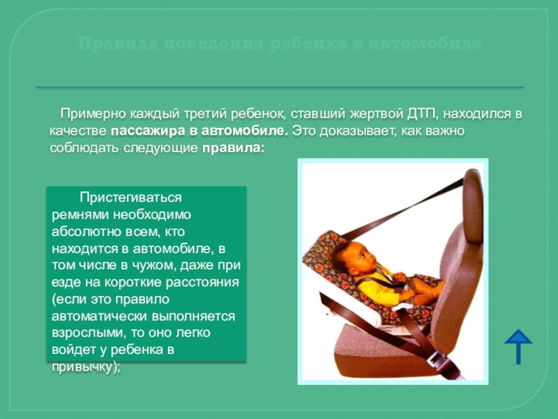 Пристегиваться ремнями необходимо абсолютно всем, кто находится в автомобиле, в том числе в чужом, даже при езде на короткие расстояния (если это правило автоматически выполняется взрослыми, то оно легко войдет у ребенка в привычку);