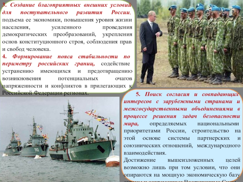 5. Поиск согласия и совпадающих интересов с зарубежными странами и межгосударственными объединениями в процессе решения задач безопасности мира, определяемых национальными приоритетами России, строительство на этой основе системы партнерских и союзнических отношений, международного взаимодействия.
