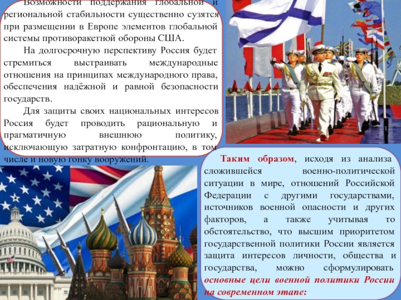 К сожалению, этого не произошло. Сохранилась опасность развязывания ядерной войны. Изменилась расстановка военных и политических сил в мире. Стремление Соединенных Штатов Америки к мировому господству, решение ими спорных вопросов с позиции силы, расширение блока НАТО, игнорирование решений ООН и мнений других государств приводит к возникновению очагов напряженности в мире, ведению войн и вооруженных конфликтов в непосредственной близости от границ России