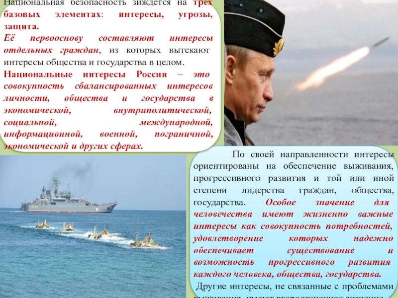 По своей направленности интересы ориентированы на обеспечение выживания, прогрессивного развития и той или иной степени лидерства граждан, общества, государства. Особое значение для человечества имеют жизненно важные интересы как совокупность потребностей, удовлетворение которых надежно обеспечивает существование и возможность прогрессивного развития каждого человека, общества, государства.