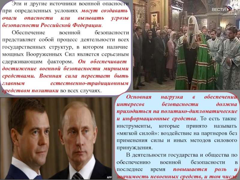 Основная нагрузка в обеспечении интересов безопасности должна приходиться на политико-дипломатические и информационные средства. То есть такие инструменты, которые принято называть «мягкой силой»: воздействие на партнеров без применения силы и иных методов силового принуждения.