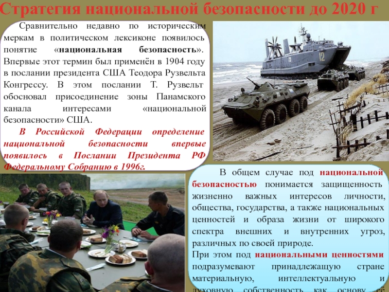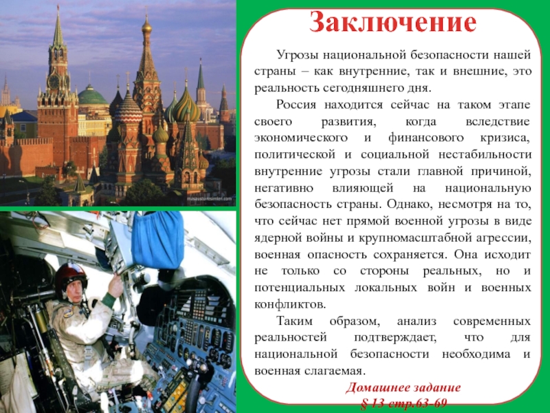Обстановка вокруг России характеризуется нестабильностью, напряженностью, обострением национально-этнических и религиозных противоречий, частым использованием Западом угрозы силой или ее прямым применением против суверенных государств. Строительство нового мирового порядка, обострение борьбы за сферы влияния, источники сырья и рынки сбыта может непосредственно затронуть национальные интересы России