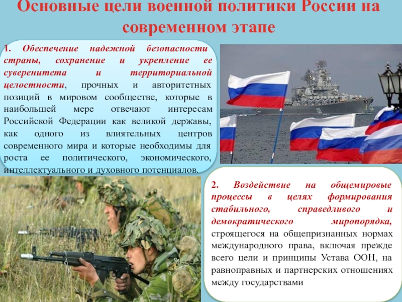 2. Воздействие на общемировые процессы в целях формирования стабильного, справедливого и демократического миропорядка, строящегося на общепризнанных нормах международного права, включая прежде всего цели и принципы Устава ООН, на равноправных и партнерских отношениях между государствами