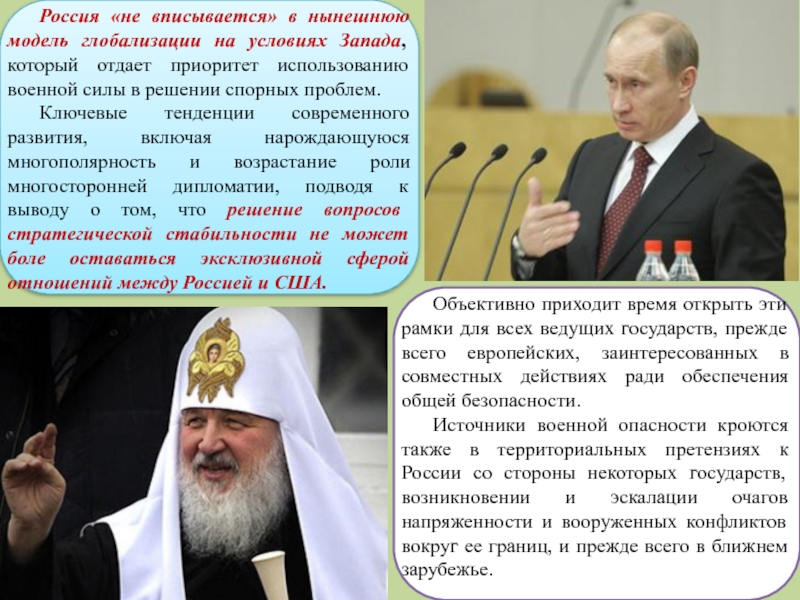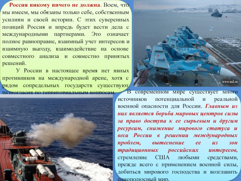 В современном мире существует много источников потенциальной и реальной военной опасности для России. Главным из них является борьба мировых центров силы за право доступа к ее сырьевым и другим ресурсам, снижение мирового статуса и веса России в решении международных проблем, вытеснение ее из зон традиционных российских интересов, стремление США любыми средствами, прежде всего с применением военной силы, добиться мирового господства и возглавить однополюсный мир.