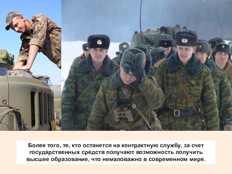 Слайд 16Более того, те, кто останется на контрактную службу, за счет государственных