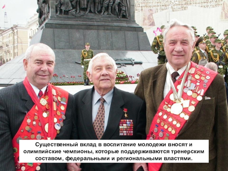 Слайд 9Существенный вклад в воспитание молодежи вносят и олимпийские чемпионы, которые поддерживаются
