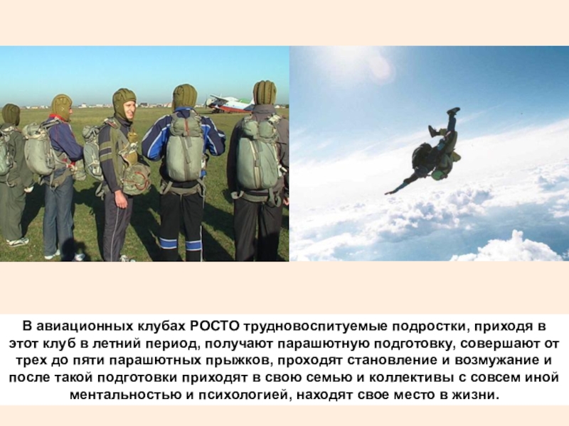 летний период, получают парашютную подготовку, совершают от трех до пяти парашютных прыжков, проходят становление и возмужание и после такой подготовки приходят в свою семью и коллективы с совсем иной ментальностью и психологией, находят свое место в жизни.