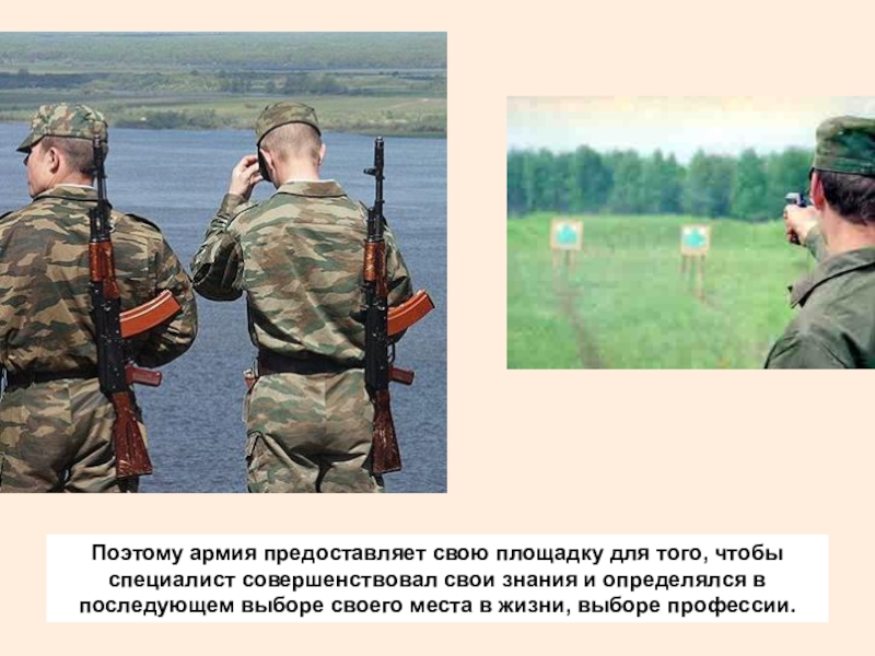 Слайд 15Поэтому армия предоставляет свою площадку для того, чтобы специалист совершенствовал свои