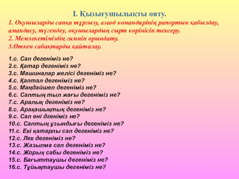 1. Оқушыларды сапқа тұрғызу, взвод командирінің рапортын қабылдау, амандасу, түгендеу, оқушылардың сырт көрінісін тексеру.