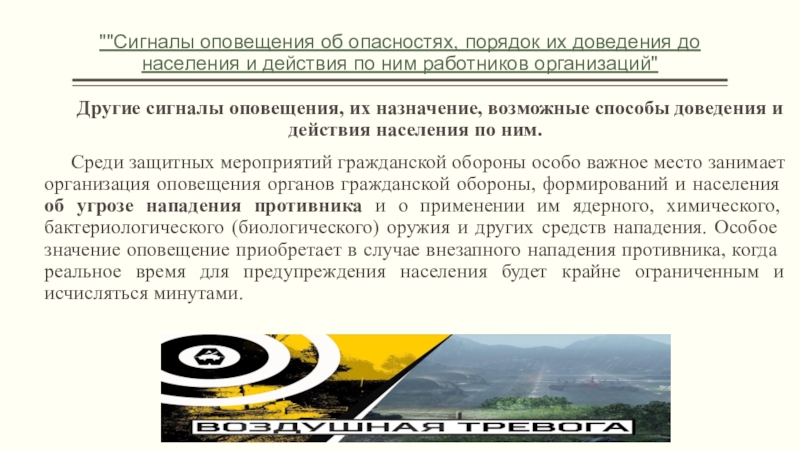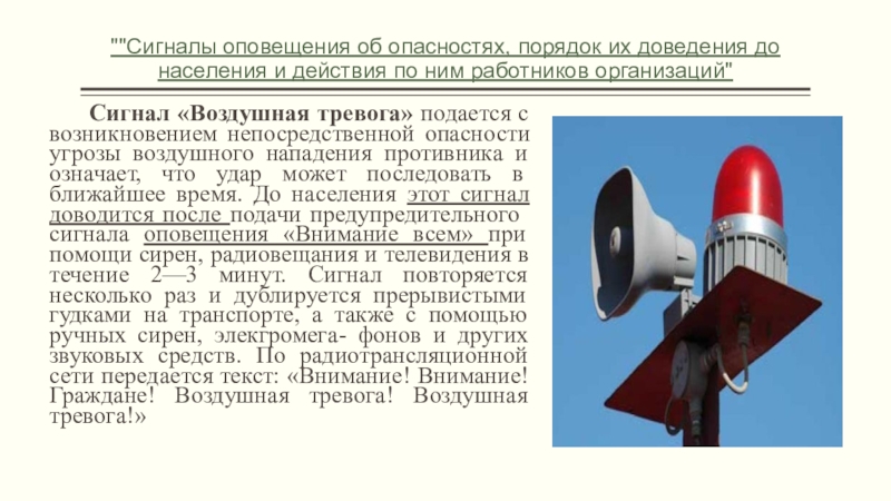 Сигнал «Воздушная тревога» подается с возникновением непосредственной опасности угрозы воздушного нападения противника и означает, что удар может последовать в ближайшее время. До населения этот сигнал доводится после подачи предупредительного сигнала оповещения «Внимание всем» при помощи сирен, радиовещания и телевидения в течение 2—3 минут. Сигнал повторяется несколько раз и дублируется прерывистыми гудками на транспорте, а также с помощью ручных сирен, элекгромега- фонов и других звуковых средств. По радиотрансляционной сети передается текст: «Внимание! Внимание! Граждане! Воздушная тревога! Воздушная тревога!»