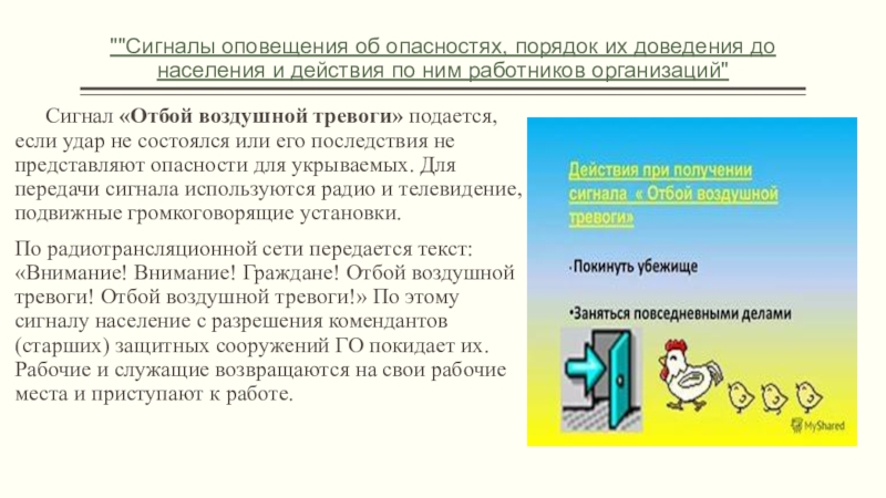 По радиотрансляционной сети передается текст: «Внимание! Внимание! Граждане! Отбой воздушной тревоги! Отбой воздушной тревоги!» По этому сигналу население с разрешения комендантов (старших) защитных сооружений ГО покидает их. Рабочие и служащие возвращаются на свои рабочие места и приступают к работе.