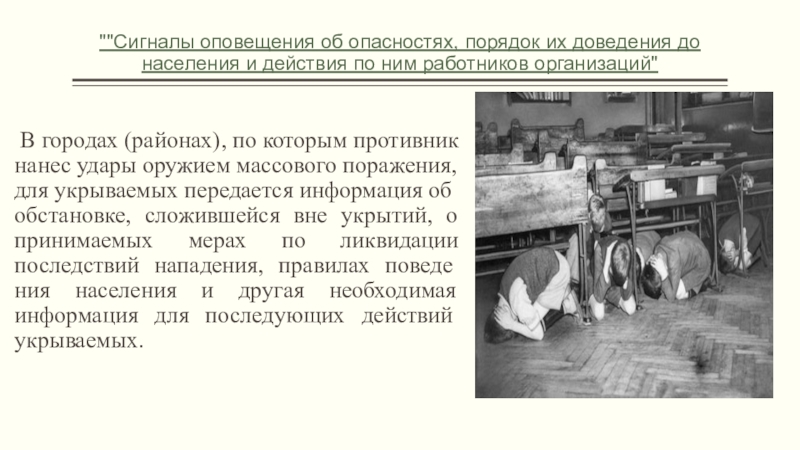 В городах (районах), по которым противник нанес удары оружием массового поражения, для укрываемых передается информация об обстановке, сложившейся вне укрытий, о принимаемых мерах по ликвидации последствий нападения, правилах поведения населения и другая необходимая информация для последующих действий укрываемых.