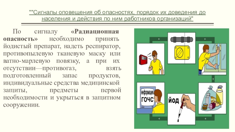 По сигналу «Радиационная опасность» необходимо принять йодистый препарат, надеть респиратор, противопылевую тканевую маску или ватно-марлевую повязку, а при их отсутствии—противогаз, взять подготовленный запас продуктов, индивидуальные средства медицинской защиты, предметы первой необходимости и укрыться в защитном сооружении.
