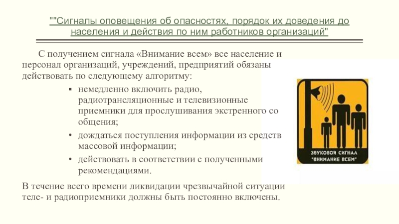 С получением сигнала «Внимание всем» все население и персонал организаций, учреждений, предприятий обязаны действовать по следующему алгоритму: