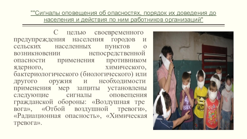 С целью своевременного предупреждения населения городов и сельских населенных пунктов о возникновении непосредственной опасности применения противником ядерного, химического, бактериологического (биологического) или другого оружия и необходимости применения мер защиты установлены следующие сигналы оповещения гражданской обороны: «Воздушная тревога», «Отбой воздушной тревоги», «Радиационная опасность», «Химическая тревога».