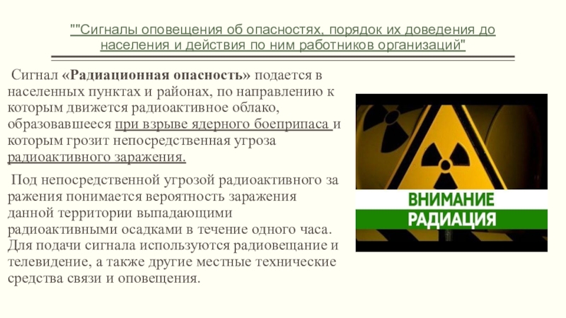 Сигнал «Радиационная опасность» подается в населенных пунктах и районах, по направлению к которым движется радиоактивное облако, образовавшееся при взрыве ядерного боеприпаса и которым грозит непосредственная угроза радиоактивного заражения.
