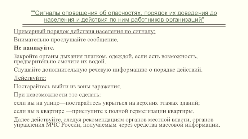 Во всех случаях следует действовать быстро, но спокойно, уверенно и без паники. Строгое соблюдение правил поведения по этому сигналу значительно сокращает потери людей.