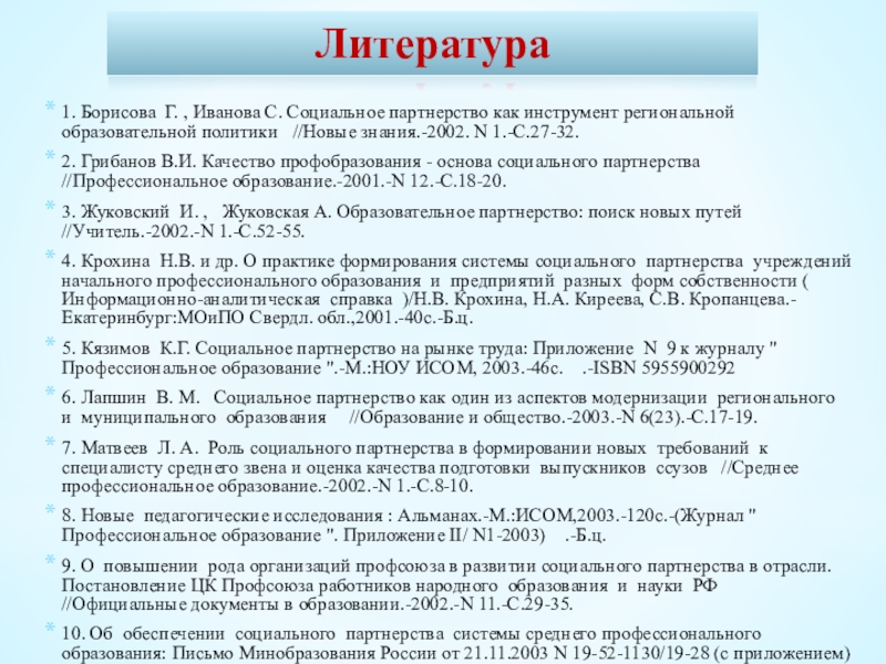 7. Матвеев Л. А. Роль социального партнерства в формировании новых требований к специалисту среднего звена и оценка качества подготовки выпускников ссузов //Среднее профессиональное образование.-2002.-N 1.-С.8-10.