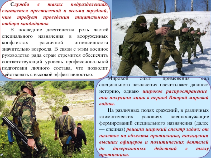 На различных полях сражений, в различных климатических условиях военнослужащие формирований специального назначения (далее — спецназ) решали широкий спектр задач: от налетов на объекты противника, похищения высших офицеров и политических деятелей до диверсионных действий в тылу противника.